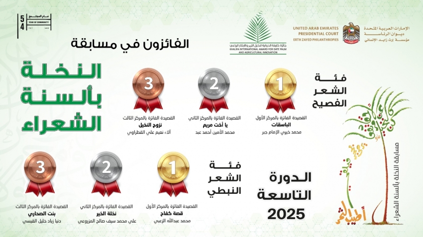 أعلنت الأمانة العامة لجائزة خليفة الدولية لنخيل التمر والابتكار الزراعي عن أسماء الفائزين بمسابقة "النخلة بألسنة الشعراء" بدورتها التاسعة 2025 التي تنظمها برعاية كريمة من معالي الشيخ نهيان مبارك آل نهيان، وزير التسامح والتعايش، رئيس مجلس أمناء الجائزة، وجاءت النتائج على النحو التالي: